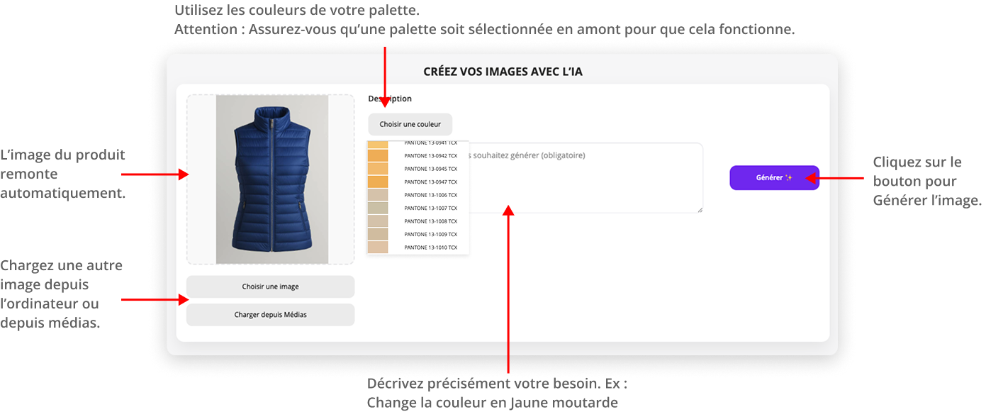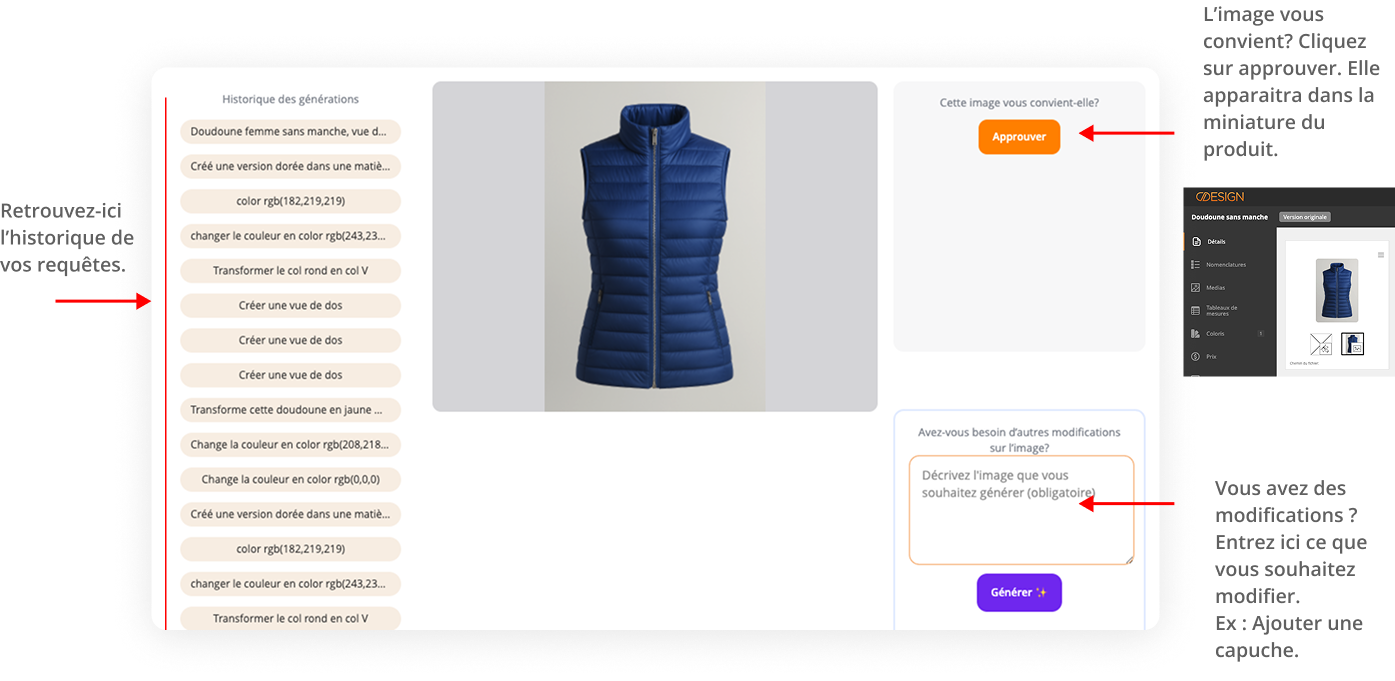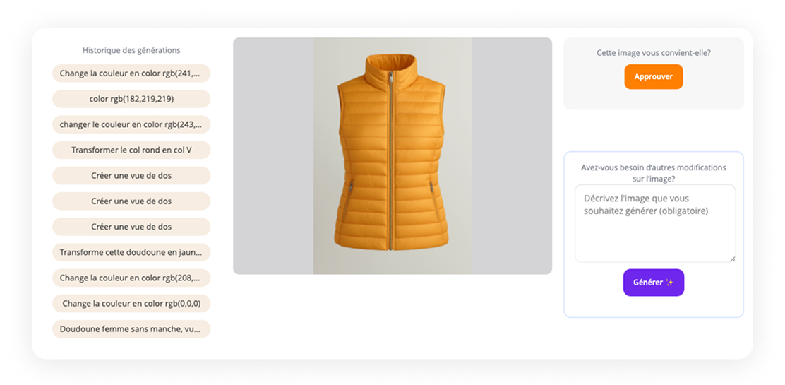 - Vous pouvez également l’utiliser pour faire évoluer rapidement un modèle existant : changer les couleurs à partir de votre palette, ajouter une capuche, une broderie ou du texte, et explorer de multiples variantes en quelques clics.