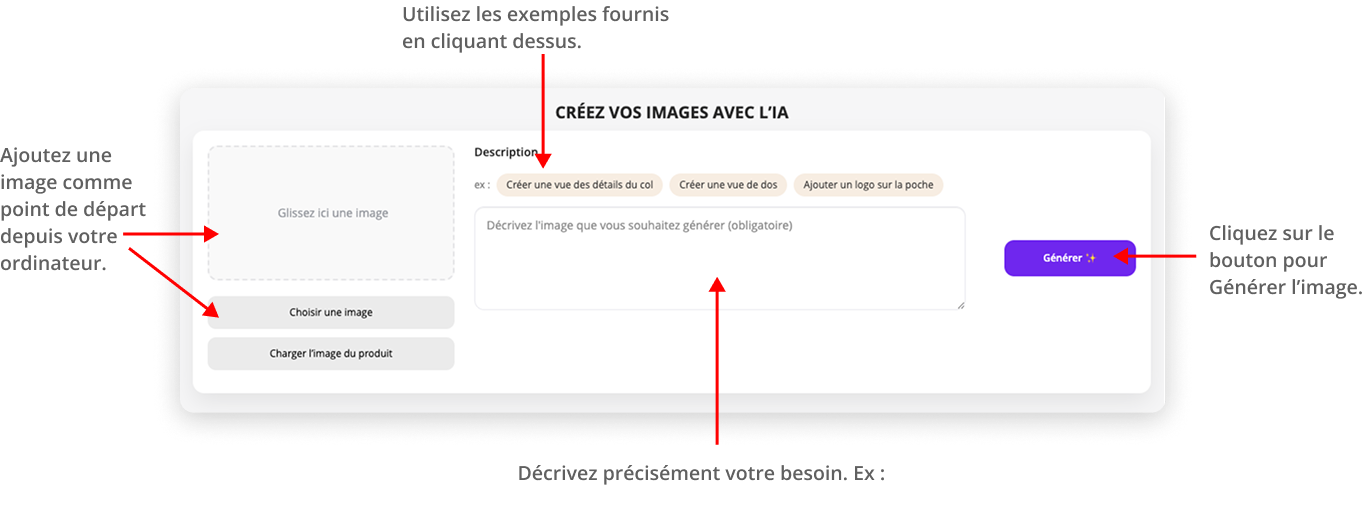 - Décrivez-lui précisément votre concept, vos inspirations et vos envies : il génère instantanément l’image de votre modèle.