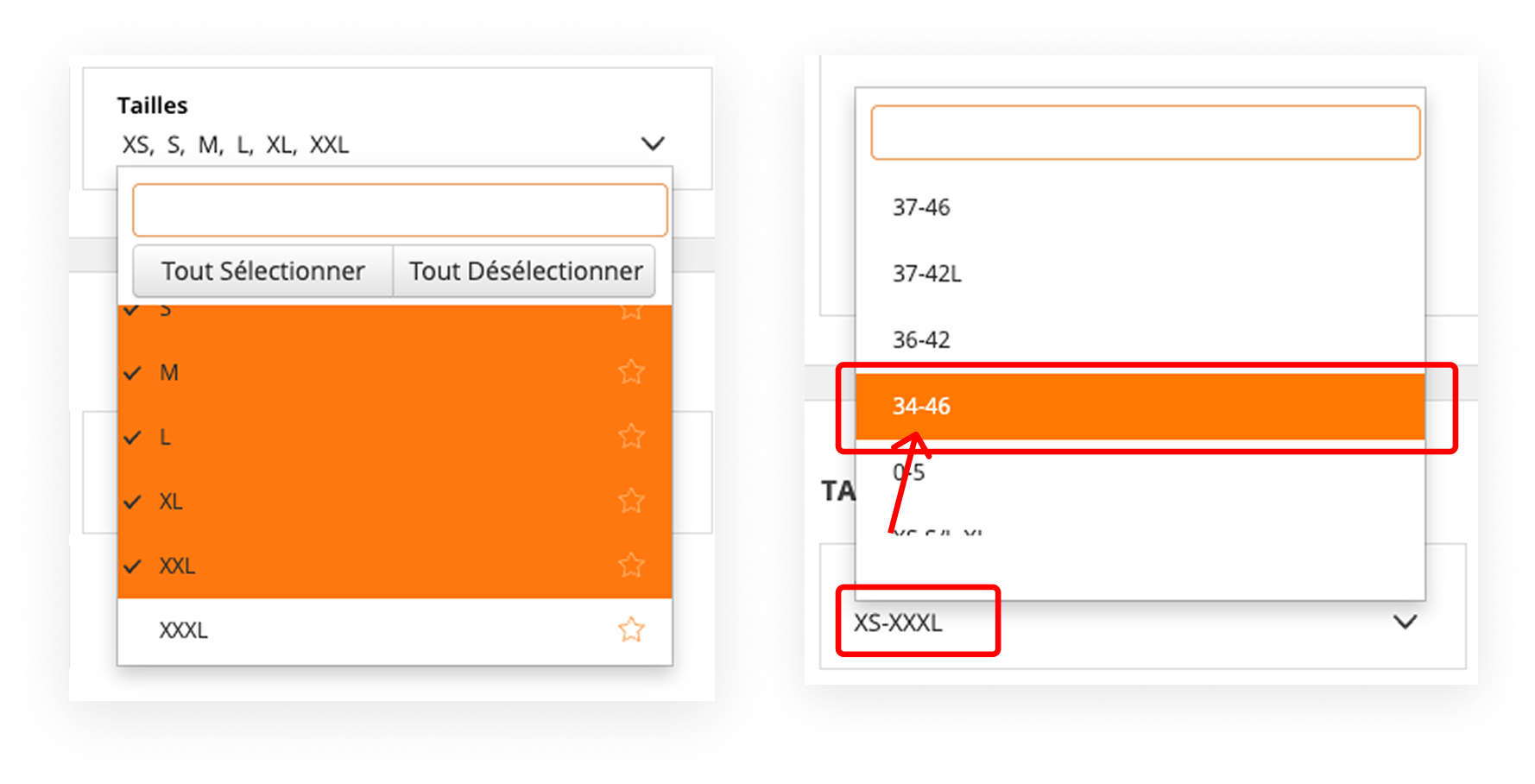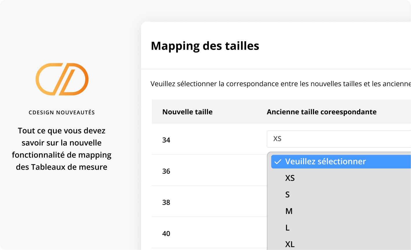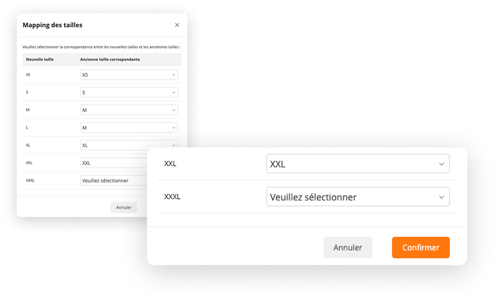 Dans le popup du mapping, vous pouvez choisir vos correspondances entre les anciennes tailles et les nouvelles tailles. Ex : 34 >>> XS.