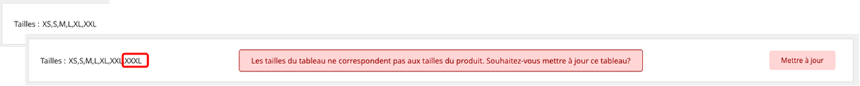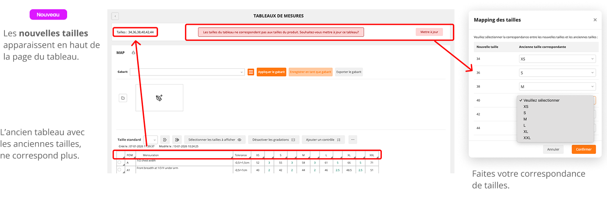 Dans la page du Tableau de mesure : l’alerte vous prévient de l’incohérence. Cliquez sur le Bouton pour « Mettre à jour ». Faites votre correspondance de tailles et validez pour que votre tableau s’adapte avec les nouvelles tailles.