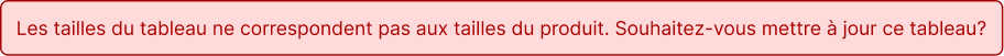 Que vous mettiez à jour la liste des tailles depuis la page de détails du produit, que vous importiez un tableau depuis un autre produit ou à partir d’un gabarit, il est possible que les tailles du tableau ne correspondent plus exactement à celles du produit.