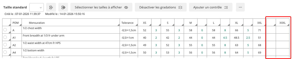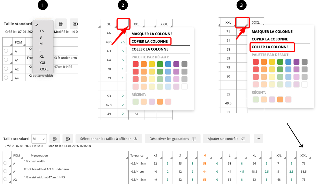 3 – Collez dans la colonne vide de gradation. La dernière taille va se remplir automatiquement.