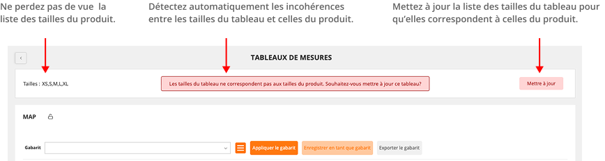 - Détectez automatiquement les incohérences entre les tailles du tableau et celles du produit.