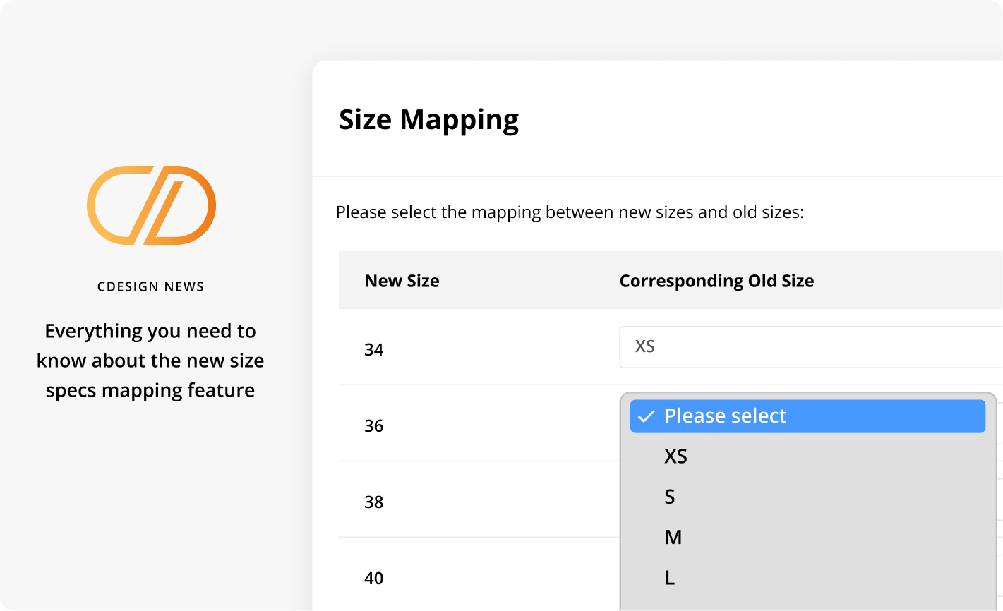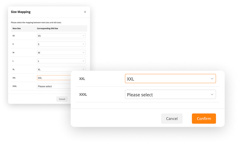 In the mapping pop-up, you can define the correspondence between old sizes and new sizes.